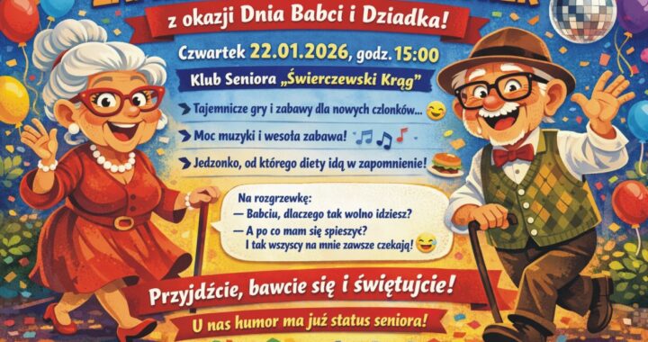 Klub Seniora Świerczewski Krąg zaprasza wszystkich swoich wspaniałych Babć, Dziadków oraz ich sympatyków na wyjątkowy, pełen humoru wieczorek, który odbędzie się w czwartek 22.01.2026 o godz. 15:00 w naszej siedzibie.